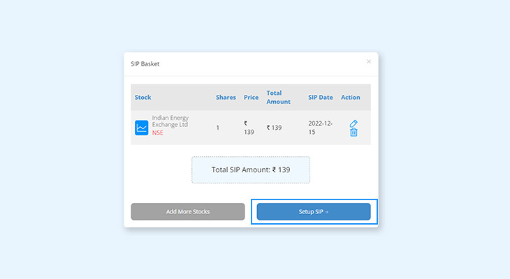 Step 4: Enter the number of the shares you want to invest in, select a start date for your monthly SIP, then click on Setup & Add to basket.