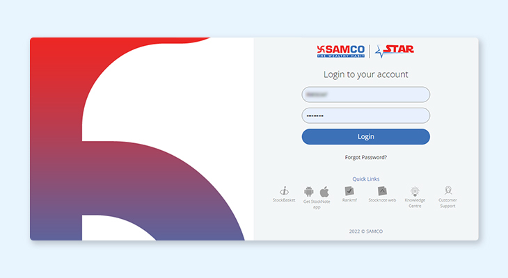 Step 1: Log in to Samco Star Backoffice using your Backoffice login credentials. If you are logging in for the first time the password will be your PAN in caps.