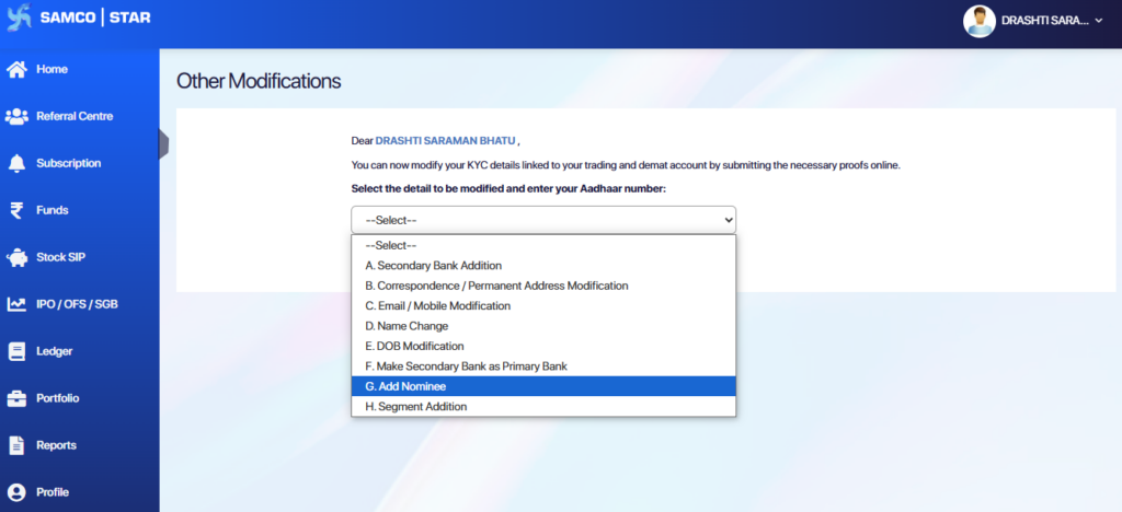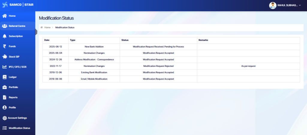 - To check the progress, go to the Modification Status section in the Samco Star Back Office.