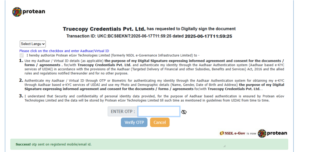 - You will be redirected to the Truecopy Credentials Pvt. Ltd. e-sign authorization page.