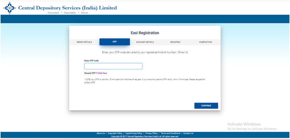 4. Enter the OTP sent to the registered email ID or mobile number and click on Continue.