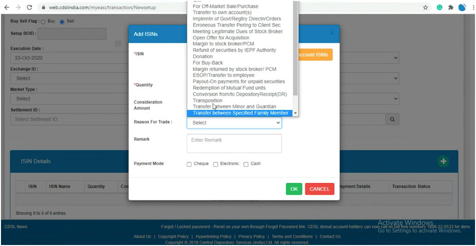 4. You need to select the ISIN. When you click on Account ISINs, you can see a list of all the ISINs in your holdings. Select the ISIN and enter the quantity and select the reason for trade from a list given.