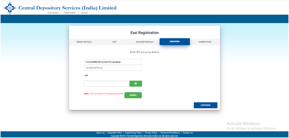 6. If multiple demat accounts are held by the same account holder, the demat ID of the accounts can be entered and grouped together. By grouping the demat IDs, multiple demat accounts can be accessed using a single user ID. Click on Continue, and the registration will be successful.