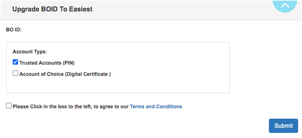 3. Select Trusted account (PIN) as the Account Type, agree to the terms and conditions and click on Submit.