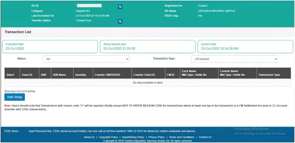 3. You need to select ‘Transaction’ and enter the execution date and enter the Beneficiary owner ID(BOID), you need to transfer the shares.