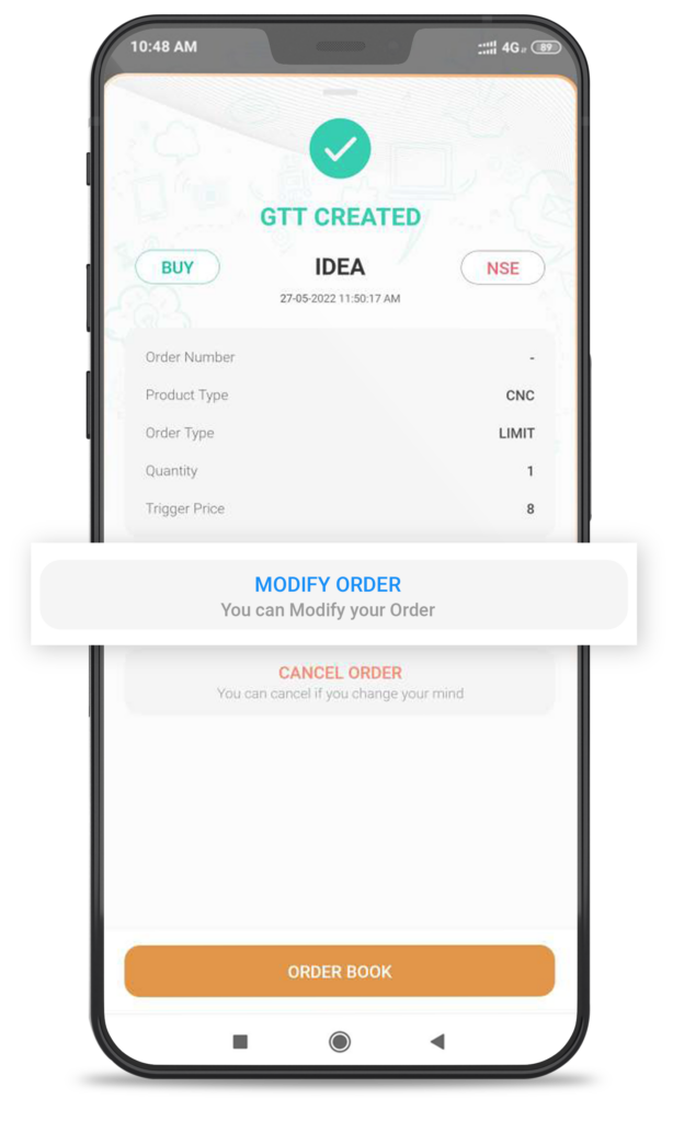 6. If you wish to change your set GTT order condition, you can tap on the ‘MODIFY ORDER’ button and change the prices and quantity as you wish. You can also cancel the order after it’s created.