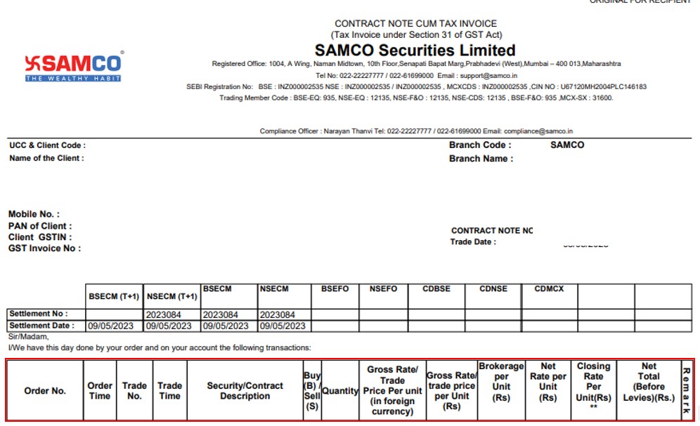 - The Net Rate per unit (Rs) column will be the same as the gross rate per unit, as brokerage charges are mentioned separately in the contract notes.